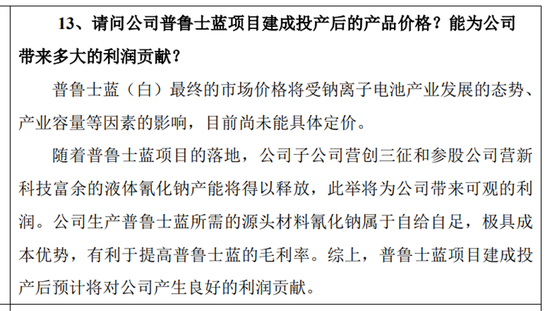 美联新材近日在接受机构调研被问及普鲁士蓝项目建成投产后能为公司带来多大利润贡献的问题时表示,随着普鲁士蓝项目的落地,公司子公司营创三征和参股公司营新科技富余的液体氰化钠产能将得以释放,此举将为公司带来可观的利润。公司生产普鲁士蓝所需的源头材料氰化钠属于自给自足,极具成本优势,有利于提高普鲁士蓝的毛利率。综上,普鲁士蓝项目建成投产后预计将对公司产生良好的利润贡献。