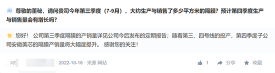 10月18日,美联新材在互动平台上回复投资者提问时表示,三聚氯氰的销售存在较为明显的季节性特征,第四季度是三聚氯氰的传统销售旺季,目前产销两旺。另外,随着第三、四号线的投产,第四季度公司子公司安徽美芯的隔膜产销量将大幅度提升。