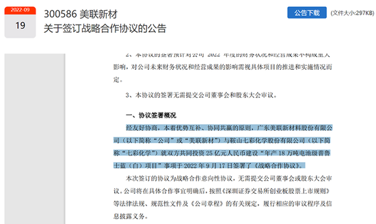 9月18日晚间,美联新材发布公告,公司与七彩化学签署了《战略合作协议》,双方暂定共同投资25亿元,建设年产18万吨电池级普鲁士蓝(白)产业化项目,致力于钠离子电池正极材料普鲁士蓝(白)系列产品的研究开发及产业化,助推钠离子电池产业发展。