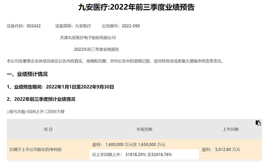 10月14日晚间,九安医疗发布2022年前三季度业绩预告,公司预计今年1-9月实现归属于上市公司股东的净利润为160亿元至163亿元,比上年同期上升31818.29%至32416.76%。报告期内,公司的iHealth试剂盒产品在美国市场需求旺盛,公司积极采取各项措施实现生产和供应链的有效运行,持续做好订单履约和市场开发,确保了客户订单的及时交付,公司业绩较去年同期大幅增长。