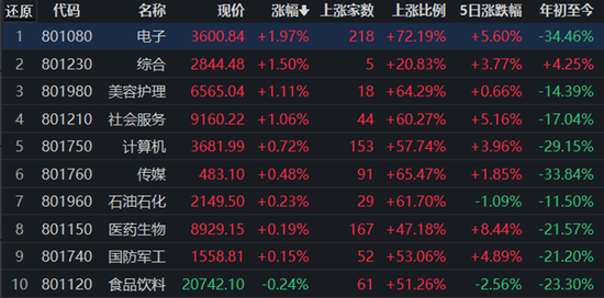 31类申万一级行业中,有9类上涨,占比29.03%,其中,电子行业涨1.97%,涨幅居首;下跌方面,电力设备行业居首,跌幅达2.78%。