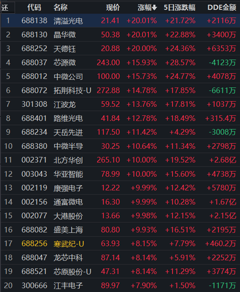 具体来看,同花顺行业中半导体及元件行业涨幅达4.09%,获得17.62亿元大单资金的净流入,居第一位。行业168只交易中的个股,有158只上涨,占比94.05%,其中,49只个股涨幅超5%。
