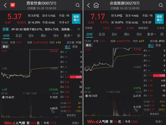 值得一提的是,西安饮食和众信旅游午后开盘便直线拉升至涨停。截至收盘,两只股票涨停板上的封单分别达8.3万手和1.9万手。