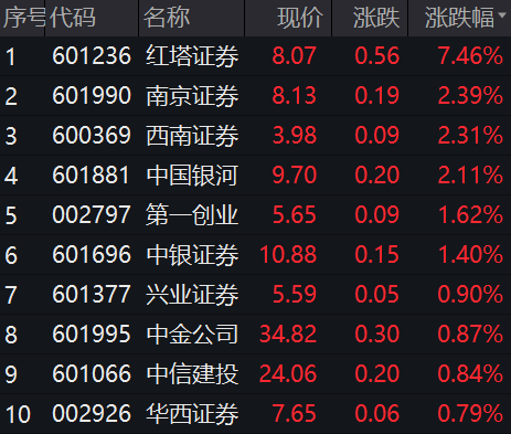 有“牛市旗手”之称的券商股午后走高,红塔证券直线拉升触板,收盘涨逾7%,南京证券、西南证券、中国银河、第一创业等跟涨。