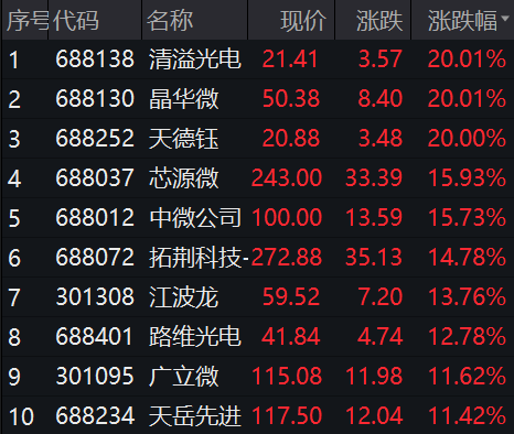 个股方面,清溢光电、晶华微、天德钰收获“20CM”涨停,芯源微、中微公司、拓荆科技、江波龙、天岳先进等多股涨超10%,康强电子、通富微电、大港股份、北方华创等涨停。