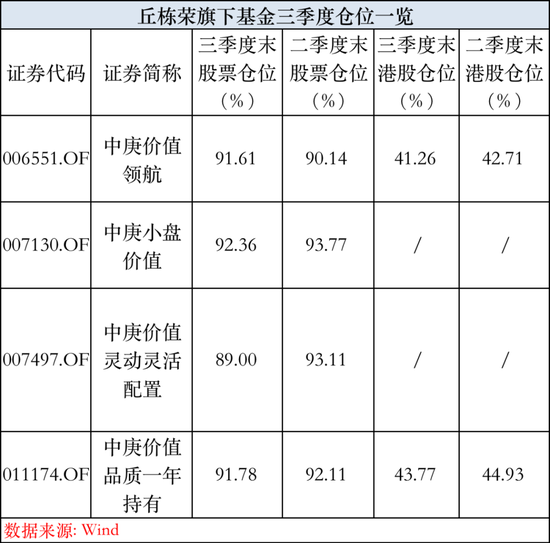 截至三季度末,中庚基金仍持有丘栋荣旗下中庚价值领航、中庚小盘价值、中庚价值灵动、中庚价值品质基金,持有份额分别为1731.09万份、2393.36万份、582.50万份、2356.73万份。