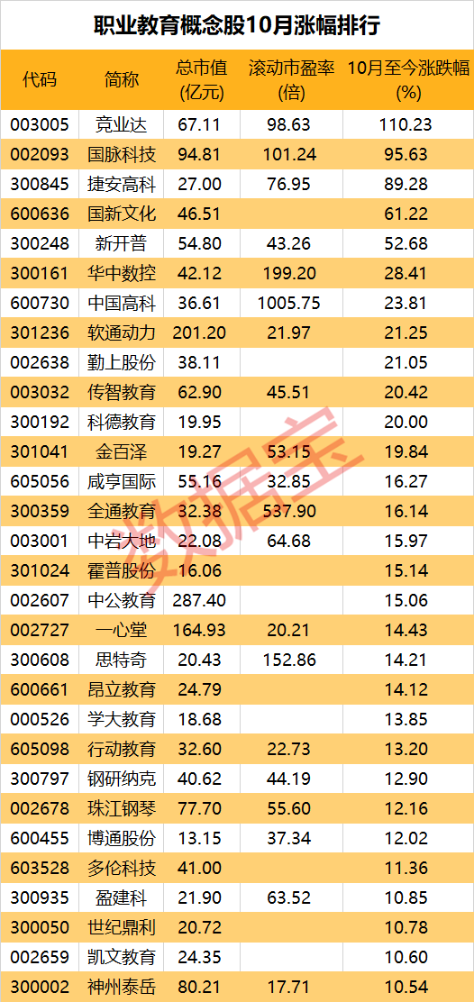 证券时报·数据宝统计,10月以来职业教育持续上涨,累计涨幅达到12.07%。30只概念股累计涨幅超过10%,11股超过20%。竞业达累计涨超110%居首,国脉科技上涨95.63%,居于次席;捷安高科国新文化新开普等涨逾50%。此外,传智教育中公教育(维权)、昂立教育等多家较有名气的职业教育公司在列。