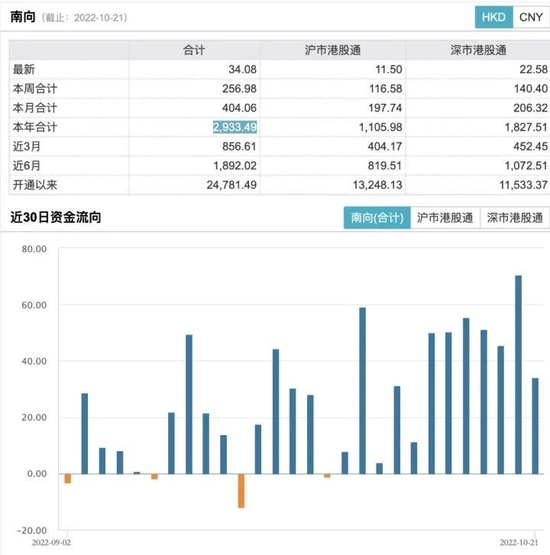值得关注的是,尽管港股持续震荡,但南向资金持续涌入。21日,wind数据显示,南向资金全天净买入34.08亿港元。时间拉长,自9月27日以来,南向资金已经连续12个交易日净买入。本周净买入的金额约256.98亿港元。截至10月21日,南向资金2022年已经净流入了2933.49亿港元。可见,在今年的复杂行情下,港股吸引投资者。