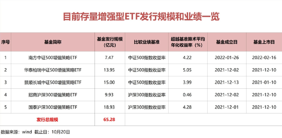 公开信息显示,首批产品分别为南方中证500增强策略ETF、华泰柏瑞中证500增强策略ETF、景顺长城中证500增强策略ETF、招商沪深300增强策略ETF、国泰沪深300增强策略ETF等5只产品,这些产品多数在2021年末、2022年初设立和上市,产品发行总规模65亿元。