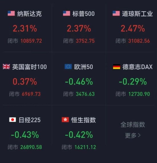 周五,美国三大股指全线收涨,道指涨2.47%报31082.56点,标普500指数涨2.37%报3752.75点,纳指涨2.31%报10859.72点。本周,美股周涨幅创阶段新高,道指涨4.89%,标普500指数涨4.74%,纳指涨5.22%。