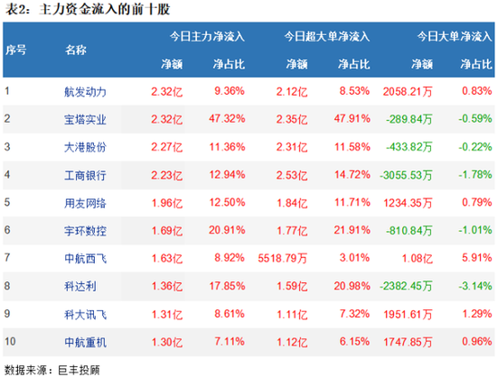 从两市个股主力资金流向来看,航发动力获主力资金净流入2.32亿,宝塔实业获主力资金2.32亿净流入,大港股份获主力资金净流入2.27亿,工商银行获主力资金净流入2.23亿,用友网络获主力资金净流入1.96亿。