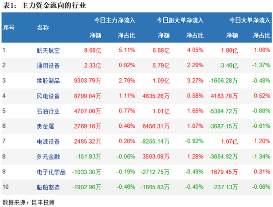 从两市行业板块资金流向来看,航天航空板块获主力资金净流入8.68亿,通用设备板块获主力资金净流入2.33亿,橡胶制品板块主力资金净流入9303.79亿,风电设备板块主力资金净流入8799.04万,石油板块主力净流入4707.06万。