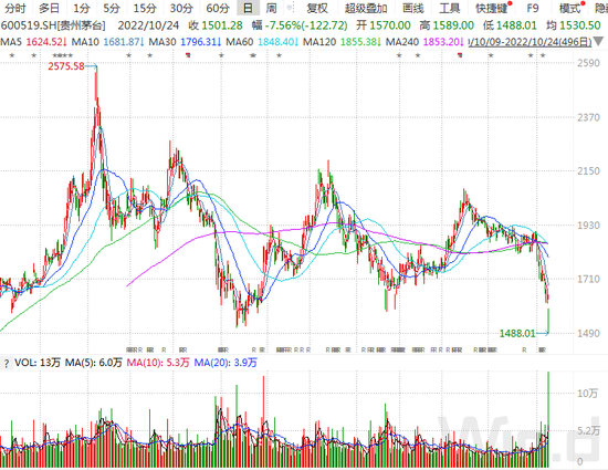 从板块龙头贵州茅台的股价走势来看,10月24日低开低走,盘中一度跌破1500元整数关口,收盘亦大幅下跌7.56%,报1501.28元,股价创2年多以来新低,成交额攀升至202.18亿元,亦创1年多以来新高。