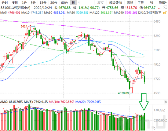 10月24日,万得全A大幅下跌1.91%,成交额为8816亿元,创10月以来最大单日成交量。从技术图形上看,今日放量下跌,并跌破10日均线,本月以来形成的反弹趋势遭到破坏。