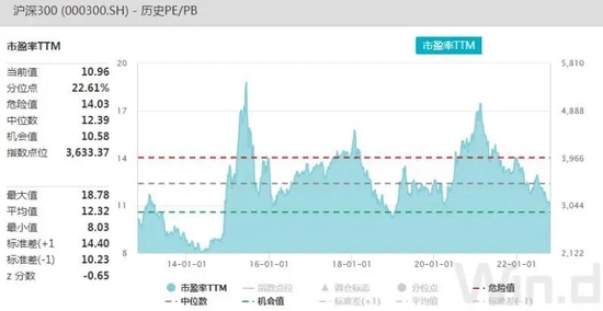 大幅下跌之后,A股市场估值优势更加明显。从近十年沪深300市盈率变动趋势来看,当前估值水平10倍左右,较前期峰值大幅回落,并快速逼近机会值。