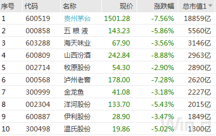从跌幅居首的食品饮料板块来看,大市值白酒公司全线杀跌,茅台、五粮液、山西汾酒、泸州老窖、洋河股份等个股跌幅均超过5%。