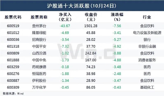 10月24日,A股放量下跌,板块方面全线收绿,白酒板块资金大幅出逃,茅台200亿成交跌逾7%,五粮液、泸州老窖等龙头亦大幅下跌。与此同时,北上资金卖出力度持续加大,单日净卖出179亿元,创沪深港通开通以来最大值。