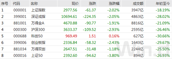 截至10月24日收盘,上证指数跌2.02%报收于2977.56点;深成指跌2.05%报收于10694.61点;创业板指跌2.43%报收于2336.84点,万得全A总成交8816亿元。