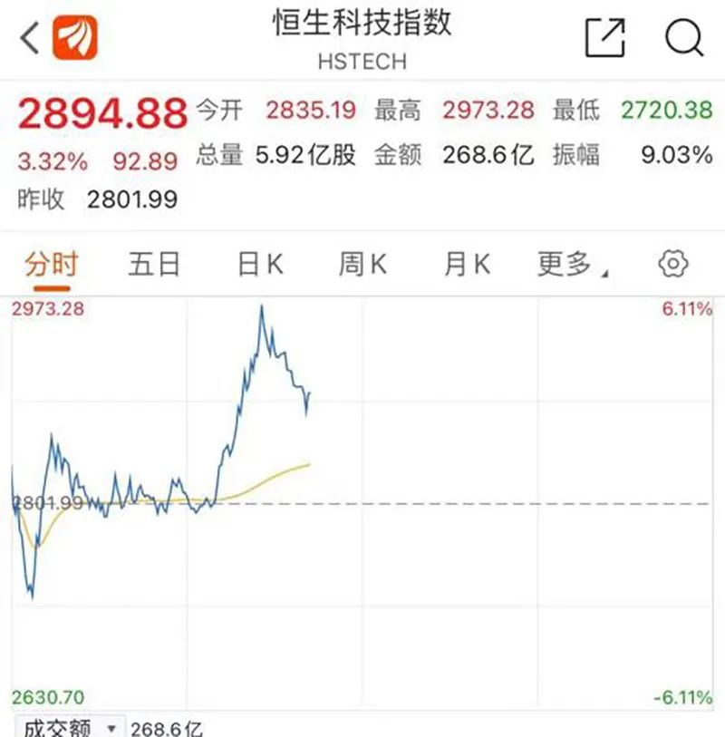 港股方面亦走出“V”型反弹,恒生科技指数盘中更是在25分钟内拉涨超过6%。截至发稿,恒生指数涨0.87%;恒生科技指数涨近4%。板块方面,教育、科技股涨幅居前,阿里健康、新东方在线涨超5%。