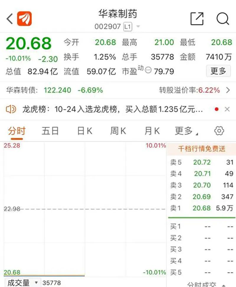 早盘,华森制药开盘跌停,截至发稿,股价报20.68元。盘面上,中药股多数下跌,莱茵生物跌超7%,新天药业、江中药业纷纷跟跌。