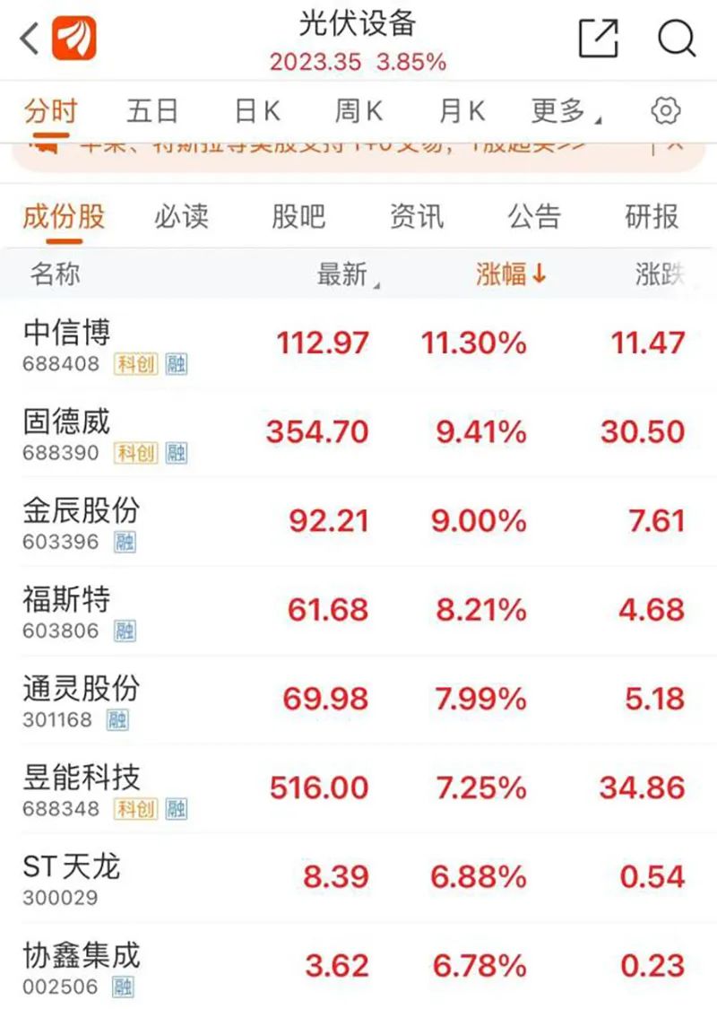 早盘光伏概念板块逆势拉升,中信博涨超11%,协鑫集成涨超6%,隆基绿能、东方日升、禾迈股份等纷纷跟涨。
