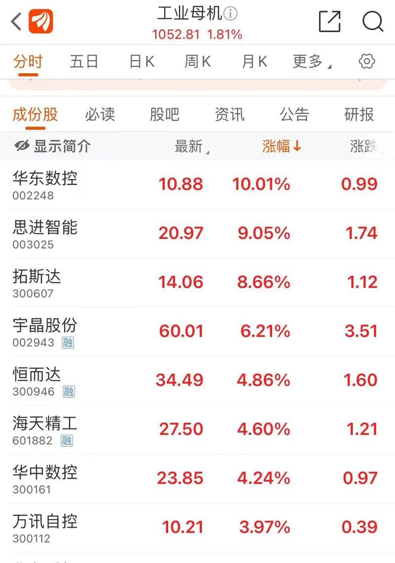 今日,工业母机概念股再度走强,华东数控涨停,拓斯达、宇晶股份、海天精工等纷纷跟涨。