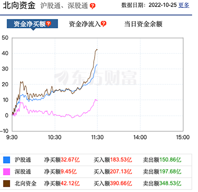 值得注意的是,北向资金半日净流入超40亿元。其中,沪股通净流入32.67亿元,深股通净流入9.45亿元。