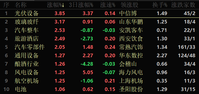 东方财富行业方面,截至10月25日11:30,86类行业中46类上涨,占比53.49%,其中,光伏设备行业涨幅达3.85%,排名首位,此外,玻璃玻纤行业涨幅也超3%。下跌的行业中,教育居首,跌幅达1.93%。