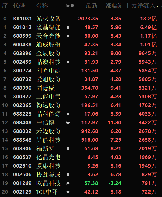 从涨幅居首的光伏设备行业看,截至10月25日11:30,该行业交易中的48只个股有45只上涨,其中15只涨幅超5%。从资金流向看,该行业上午大单资金净流入额达13.2亿元,居行业第1位。