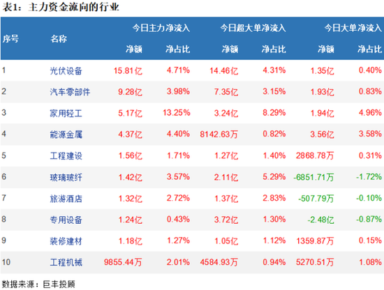 从两市行业板块资金流向来看,光伏设备板块获主力资金净流入15.81亿,汽车零部件板块获主力资金净流入9.28亿,家用轻工板块主力资金净流入5.17亿,能源金属板块主力资金净流入4.37亿,工程建设板块主力净流入1.56亿。