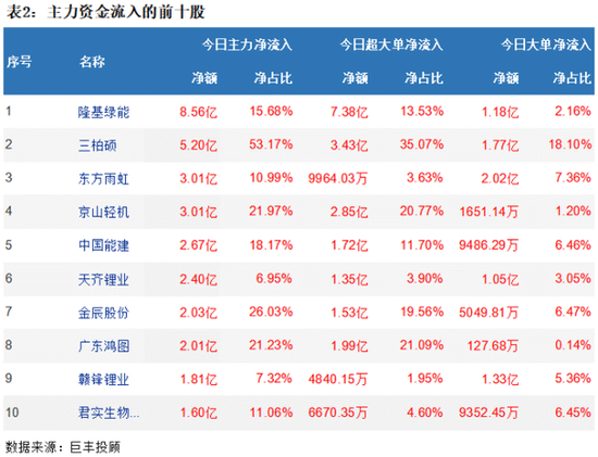 从两市个股主力资金流向来看,隆基股份获主力资金净流入8.56亿,三柏硕获主力资金5.20亿净流入,东方雨虹获主力资金净流入3.01亿,京山轻机获主力资金净流入3.01亿,中国能建获主力资金净流入2.67亿。