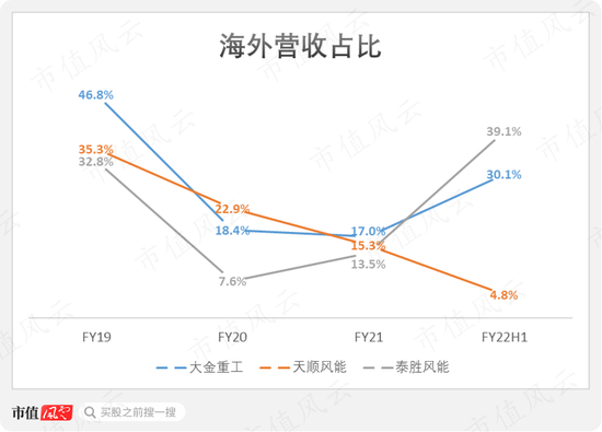 大金重工和泰胜风能的出口业务占比分别增长至30.1%和39.1%,天顺风能(002531.SZ)的出口占比下降至4.8%。