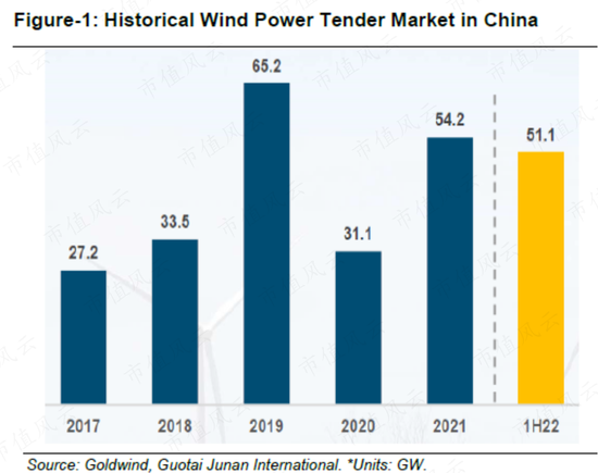 根据国泰君安国际的估算,2022年上半年风电招标量达51.1GW,同比增长62.4%。其中包括陆上新增招标容量42.0GW,和海上新增招标容量9.14GW。