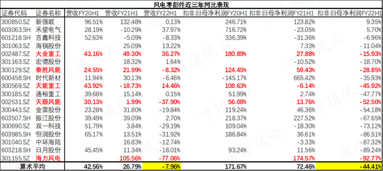 全部风电零部件公司(包括塔筒、轴承、叶片、锻件等)2022上半年营收同比增速均值为-7.96%,扣非归母净利润增速均值为-44.41%。
