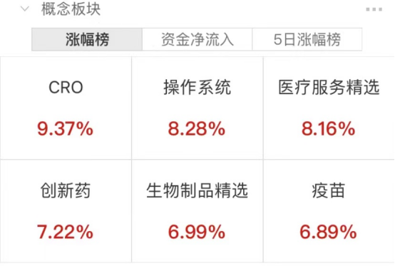 今天上午,医药板块再度霸榜,CRO、医疗服务、创新药、疫苗、生物科技、新冠检测等、仿制药等概念纷纷上扬。