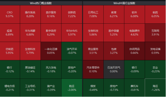 板块方面,医药板块掀涨停潮,CRO、医疗服务、创新药涨幅居前。另外软件、华为鸿蒙、互联网概念表现活跃。