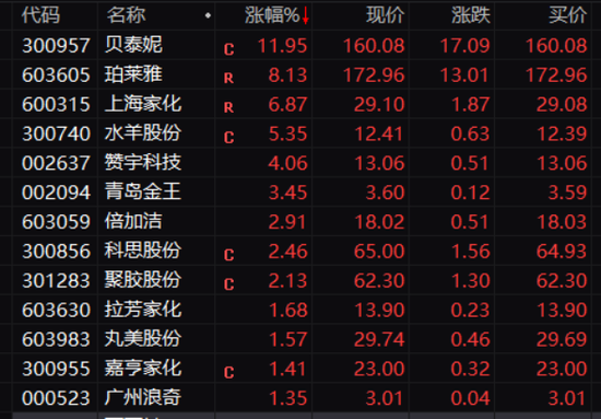 日用化工板块大涨,板块盘中涨幅超过6%。贝泰妮盘中涨幅超过10%,上海家化、珀莱雅等股票大幅上涨。