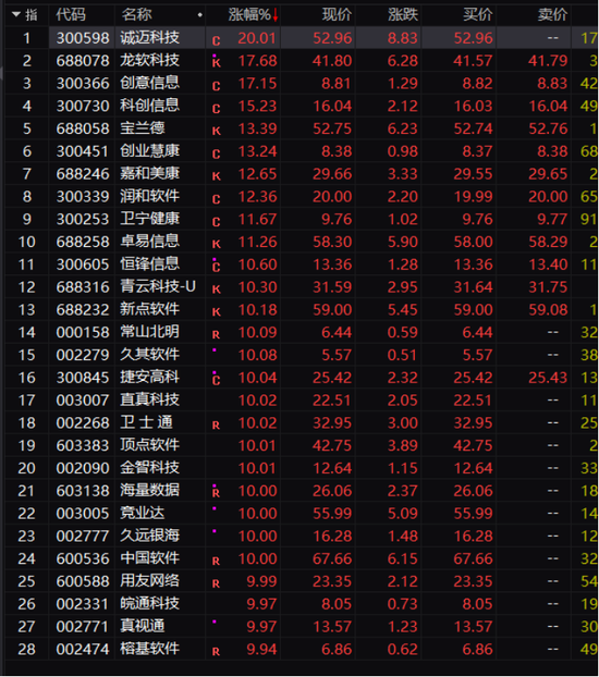 软件服务板块大幅上涨,个股大面积涨停。诚迈科技盘中“20cm”涨停,另有创意信息、龙软科技、捷安高科、宝兰德(维权)等超过20股盘中涨停或涨幅超过10%。