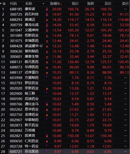 行业板块中,医药板块暴涨,板块涨幅一度逼近6%,板块内个股掀起涨停潮,合计有超过30股盘中触及涨停或涨幅超过10%。