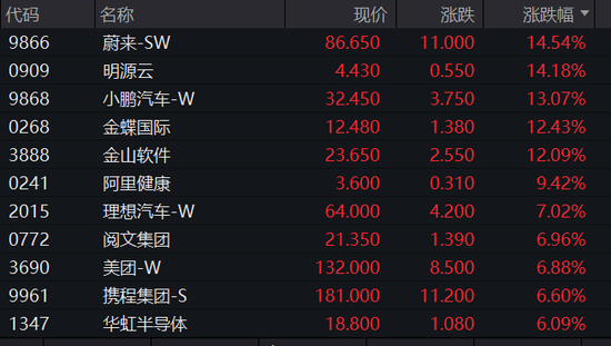 恒生科技指数成份股中,“造车新势力”集体暴涨,蔚来-SW盘中一度暴涨近18%。互联网公司股票也集体上涨。