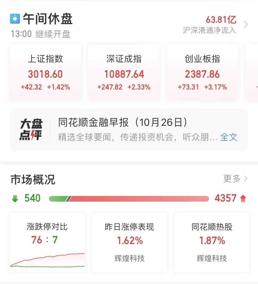北上资金净流入超63亿,两市超4300只个股上涨。