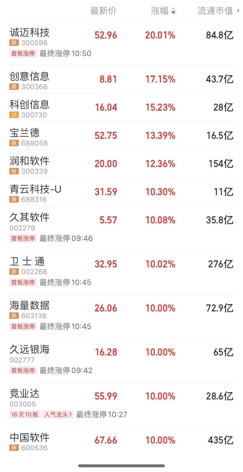信创板块再度活跃,板块内个股掀涨停潮,诚迈科技20CM涨停,中国软件、真视通、竞业达等近20股涨停。此外,教育、半导体、券商等板块均有所活跃。