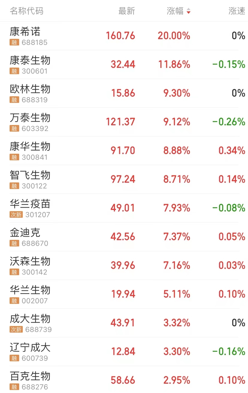 值得注意的是,10月26日,疫苗概念股大涨,康希诺涨停,康泰生物涨超11%,欧林生物、万泰生物涨超9%,康华生物、智飞生物涨超8%。