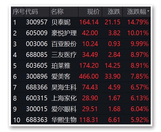 受多家公司业绩超出预期刺激,医美概念股今日表现活跃。截至收盘,贝泰妮上涨14.79%,市值达695亿元;豪悦护理、百亚股份涨停;有“医美界茅台”之称的爱美客涨近8%,市值重返千亿元上方;华熙生物涨近6%。