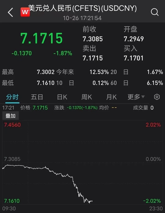 美元指数今日大跌,离岸人民币兑美元上涨1.6%至7.2000,日内上涨约1200点。在岸人民币兑美元16:30收盘大涨1260点至7.1825元。