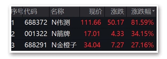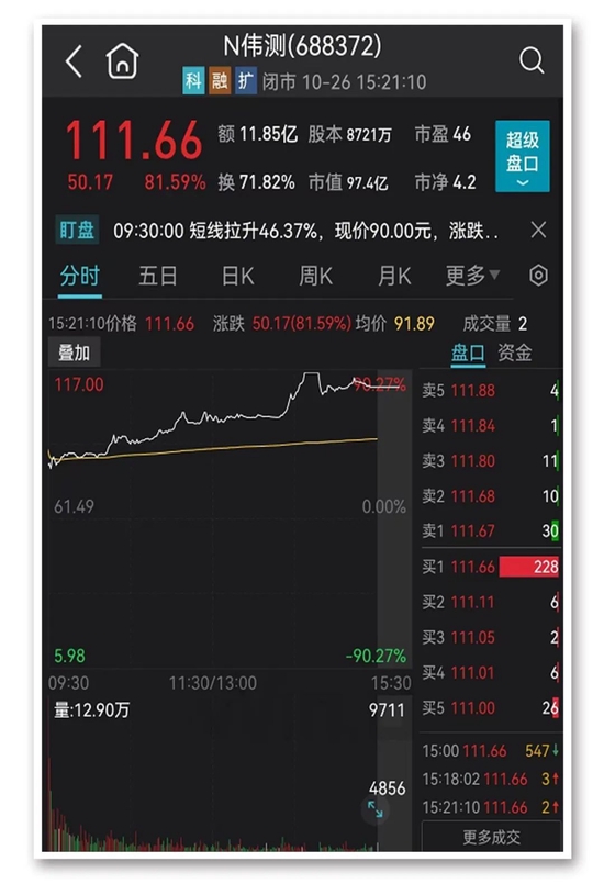 其中,N伟测(伟测科技)高开高走,收盘大涨81.59%,收报111.66元/股,成功进阶“百元股俱乐部”。值得一提的是,由于伟测科技午后大涨超90%,较开盘价涨幅达30%,一度触发临停。