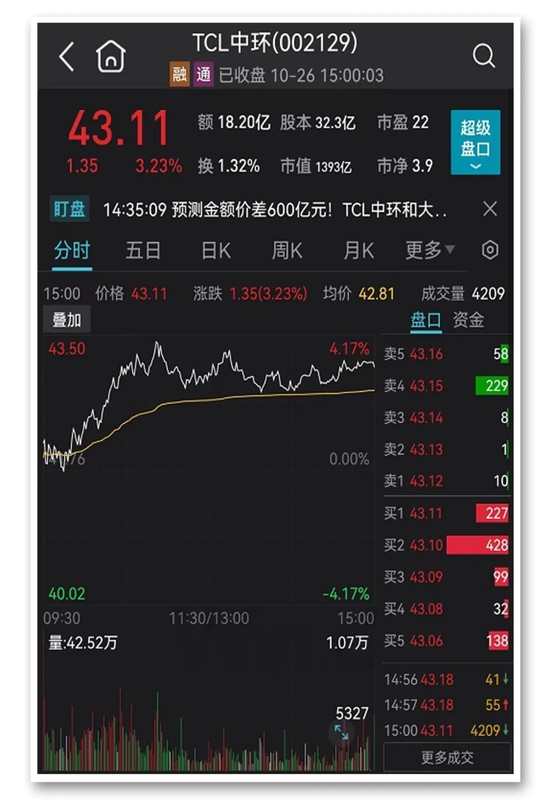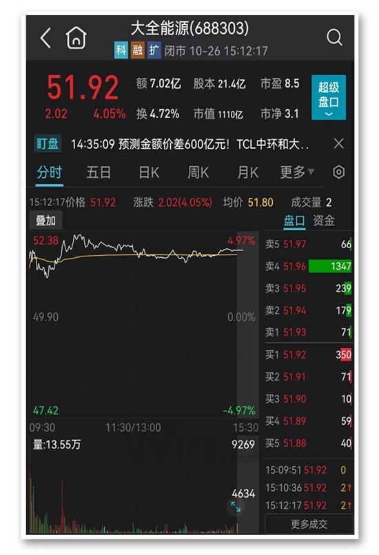 大全能源和TCL中环今日分别上涨4.05%和3.23%,市值分别达1110亿元和1393亿元。