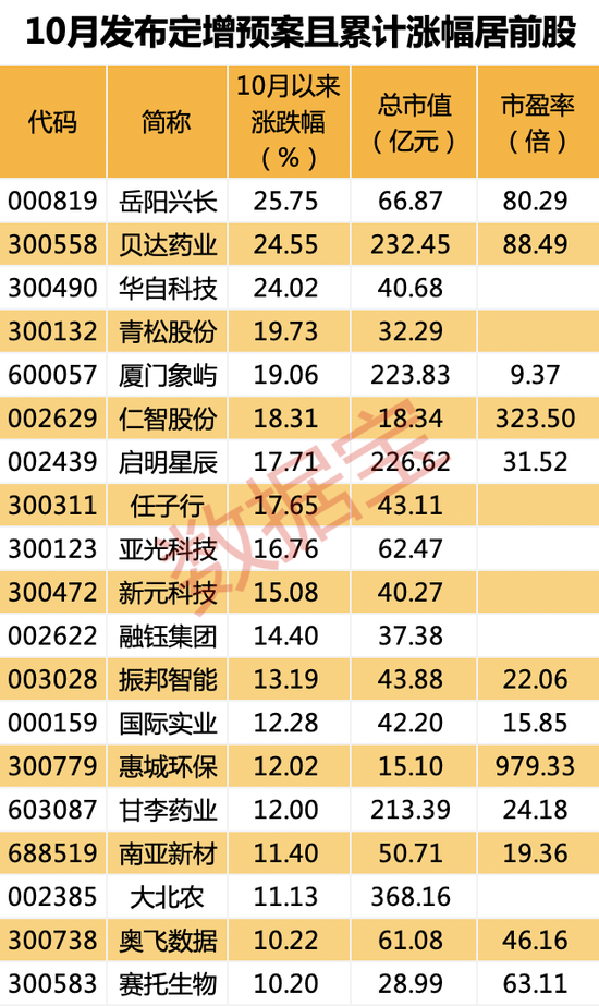 行情上来看,定增预案发布对公司股价一般具有积极作用。从10月以来的涨跌幅来看,发布定增预案的52股平均上涨6.38%,大幅跑赢同期大盘;近八成个股实现上涨,岳阳兴长、贝达药业、华自科技涨幅居前,均超过20%。