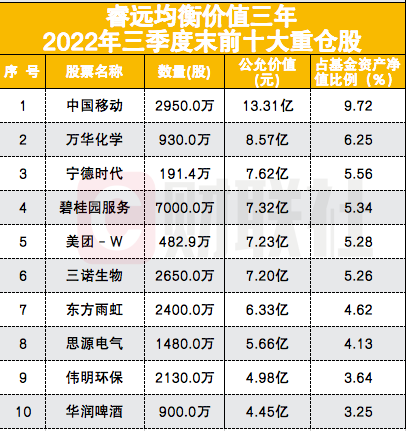 截至三季度末,睿远均衡价值三年前十大重仓股依次为:中国移动、万华化学、宁德时代、碧桂园服务、美团、三诺生物、东方雨虹、思源电气、伟明环保、华润啤酒。