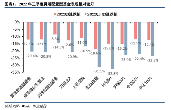 2022年三季度,普通股票型和偏股混合型基金下跌12%左右,灵活配置型基金表现相对较好,仅下跌8.5%,跑赢市场大盘指数。